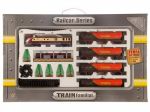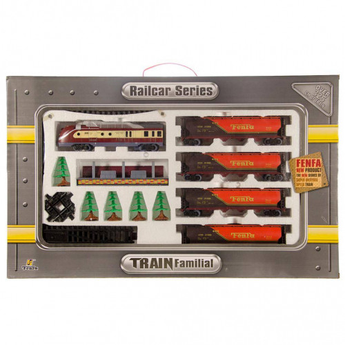 | W zestawie: elementy toru, pociąg, 4 wagony towarowe, peron, zwrotnica, 5drzewek |
