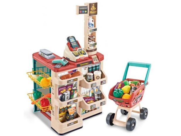 Sklep Supermarket 48 Elementów Wózek Akcesoria Kremowo-Czerwony 668-78