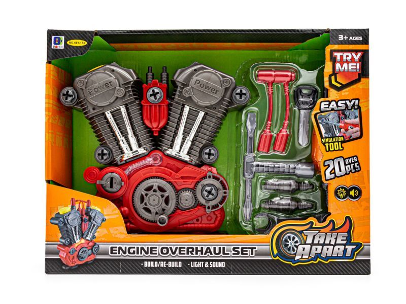 | W zestawie: duży silnik do rozkręcania, kluczyk do odpalania, świece zapłonowe, przewody zapłonowe, śrubokręt, klucz nasadowy, klucz płaski, klucz oczkowy, śruba, zestaw śrubek, oryginalne opakowanie. |
